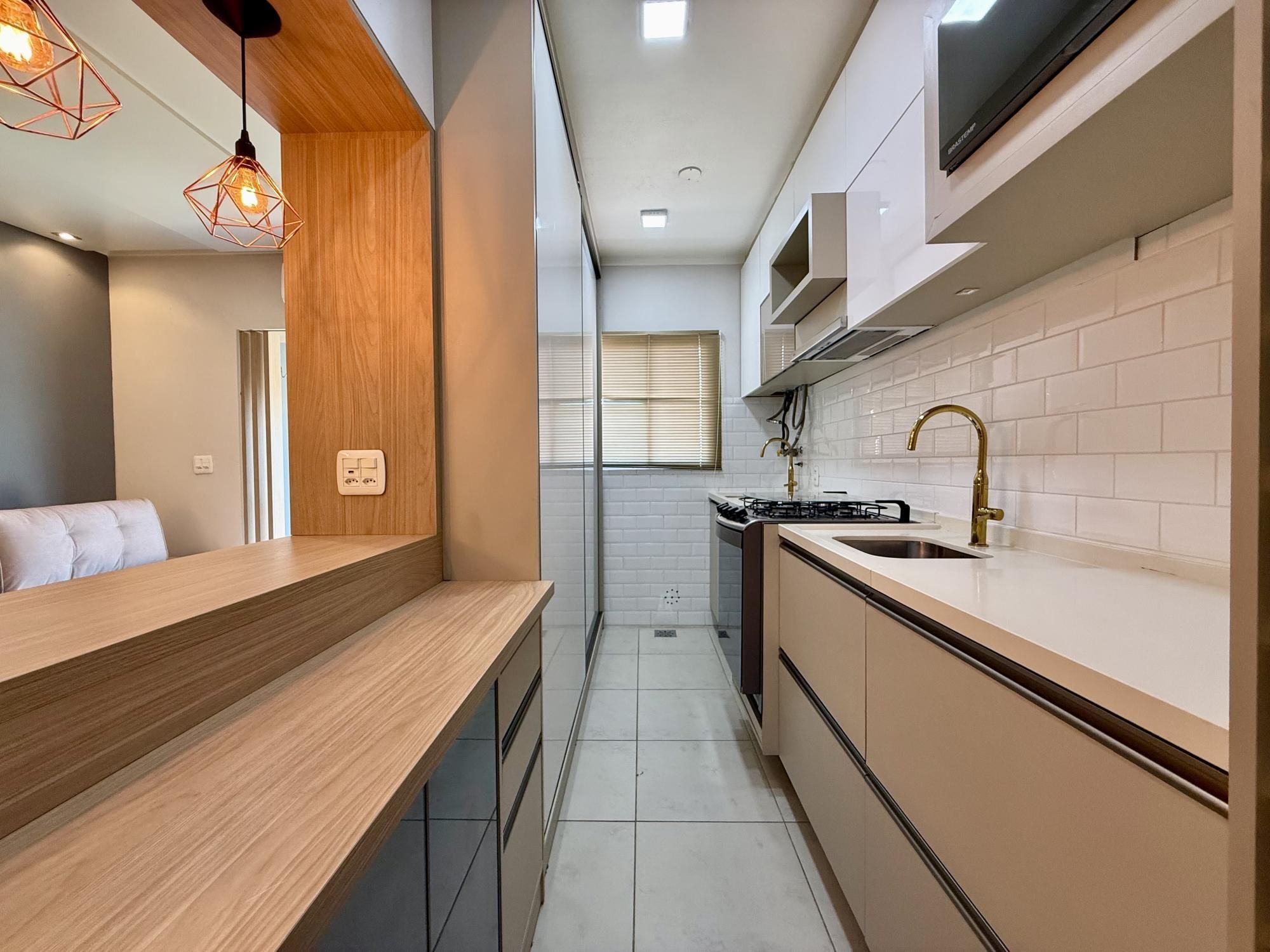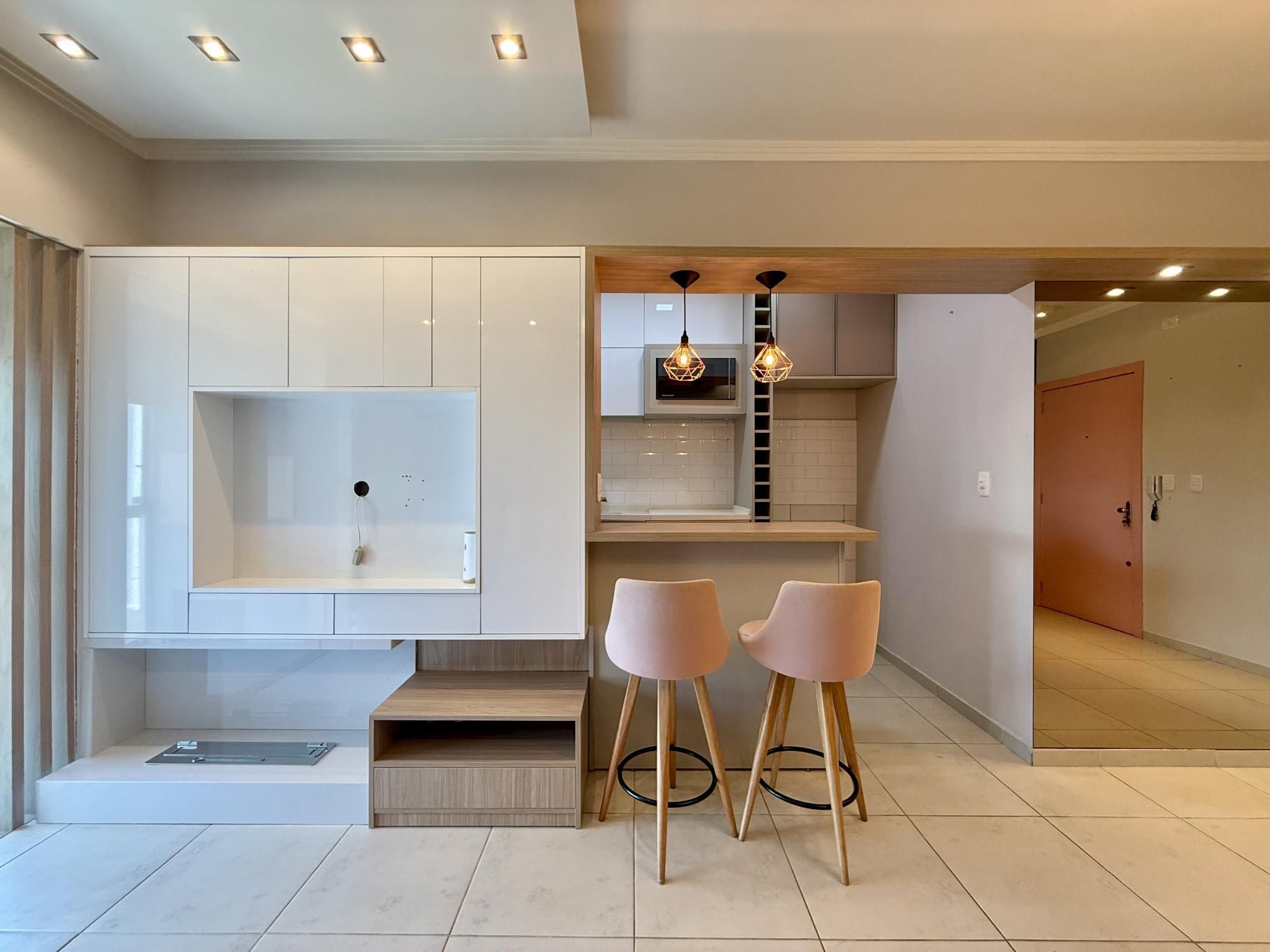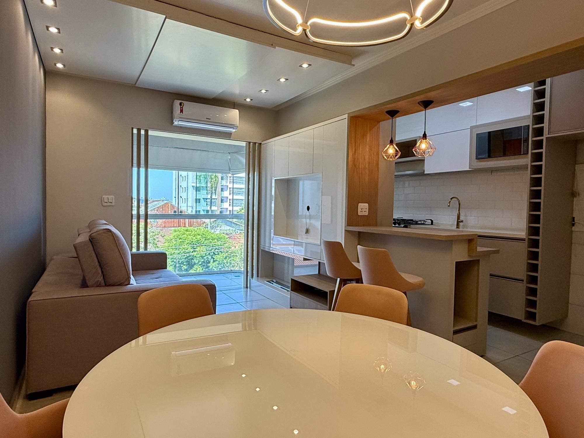 de frente, com sacada fechada, churrasqueira, semimobiliado, cozinha sob medida, painel, ar condicionado, iluminação completa, sistema de água quente e gás central.