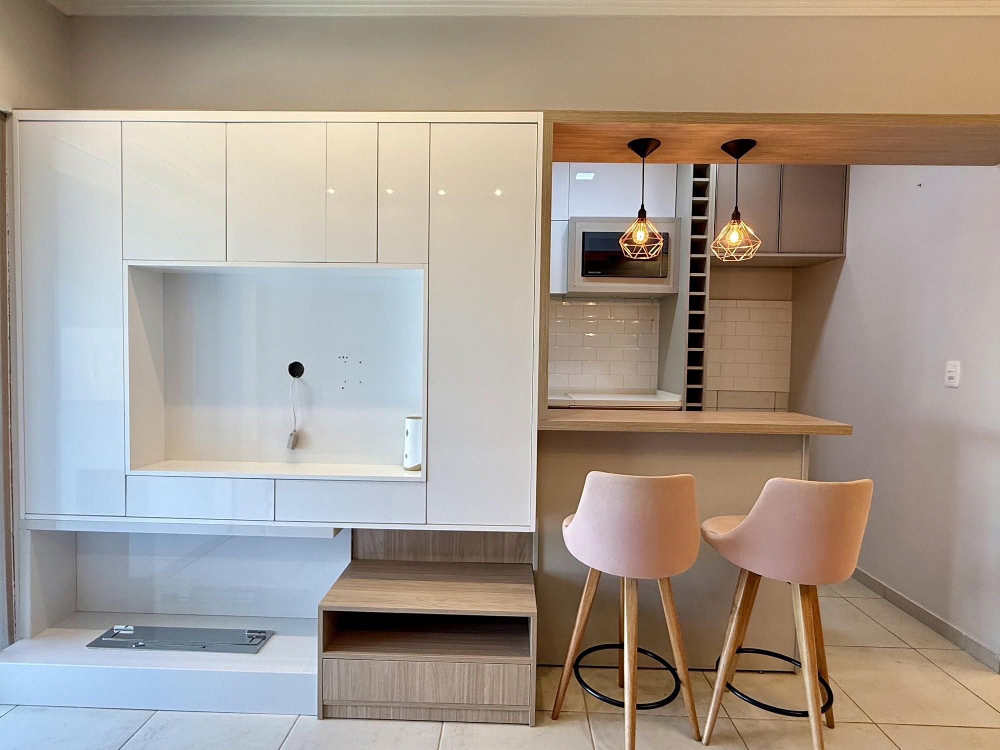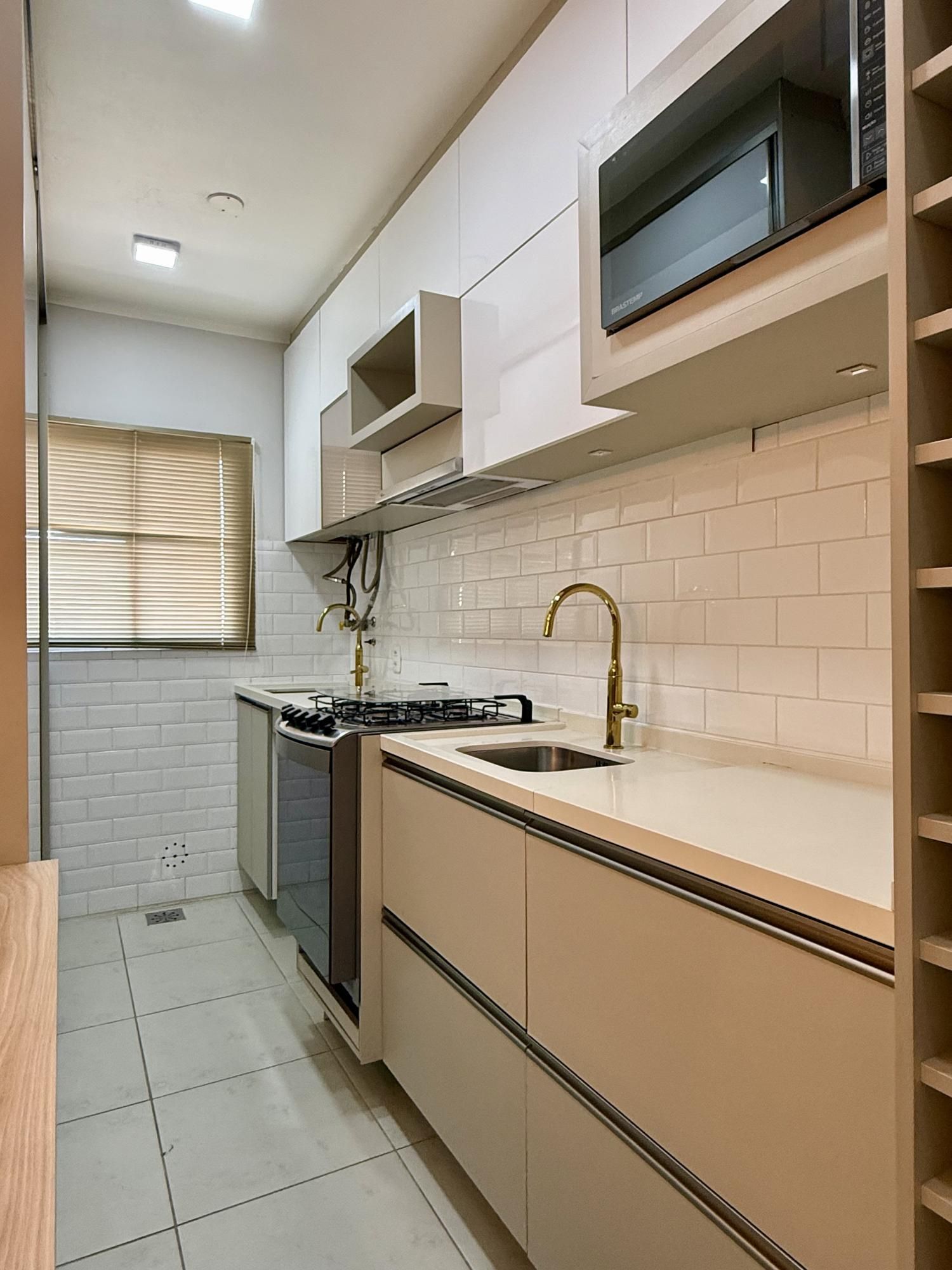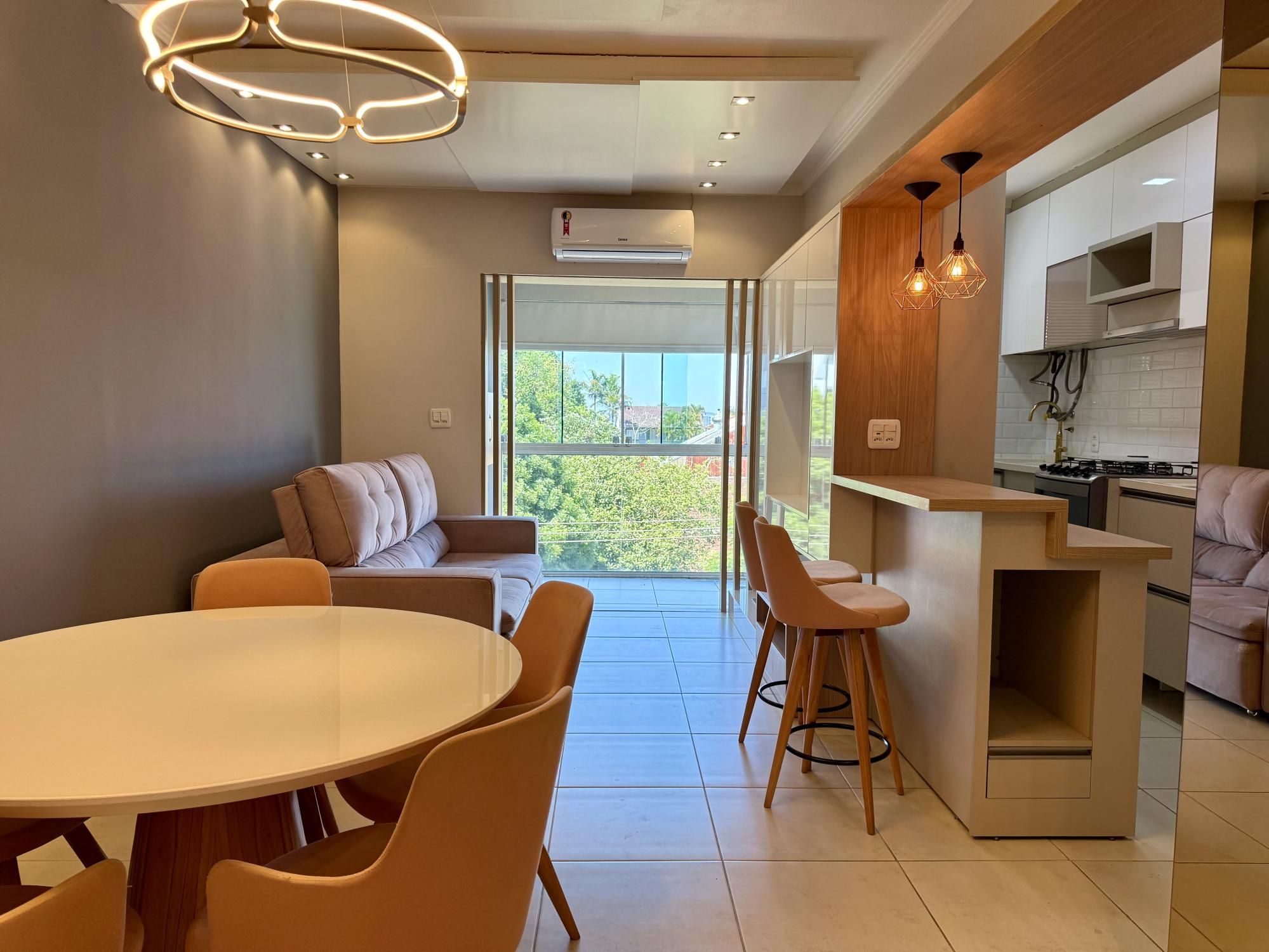 de frente, com sacada fechada, churrasqueira, semimobiliado, cozinha sob medida, painel, ar condicionado, iluminação completa, sistema de água quente e gás central.