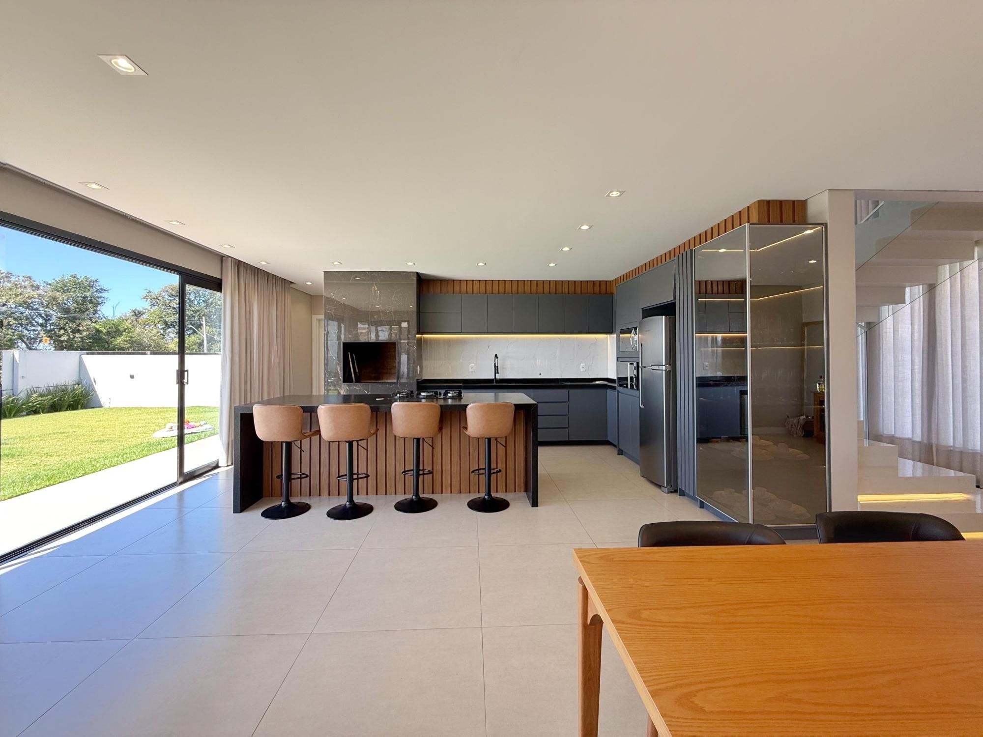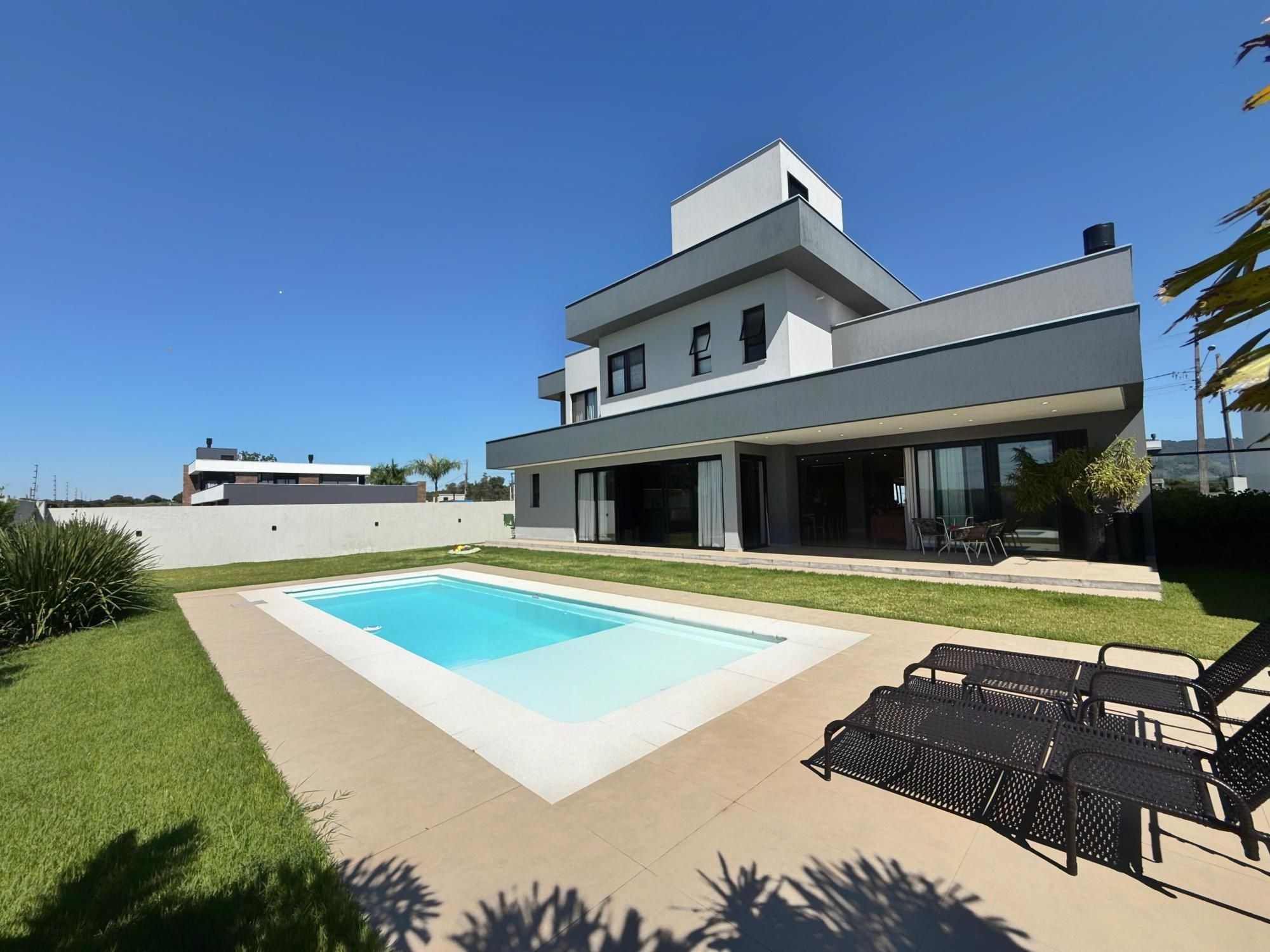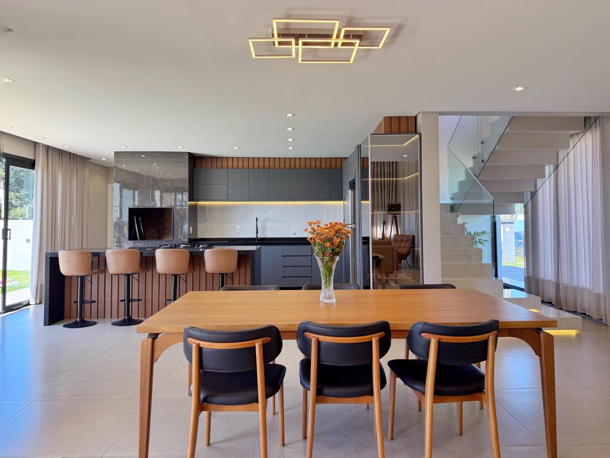 Ambientes amplos e integrados, dois andares, com ótima orientação solar, essa casa tem tudo que você precisa para morar com qualidade de vida, bem estar e segurança! São 03 suítes na parte superior, e na parte inferior, sala de estar, jantar e cozinha integradas, proporcionando facilidade na rotina e momentos com a família reunida. Lareira, pé direito alto, pátio de fundos, piscina.