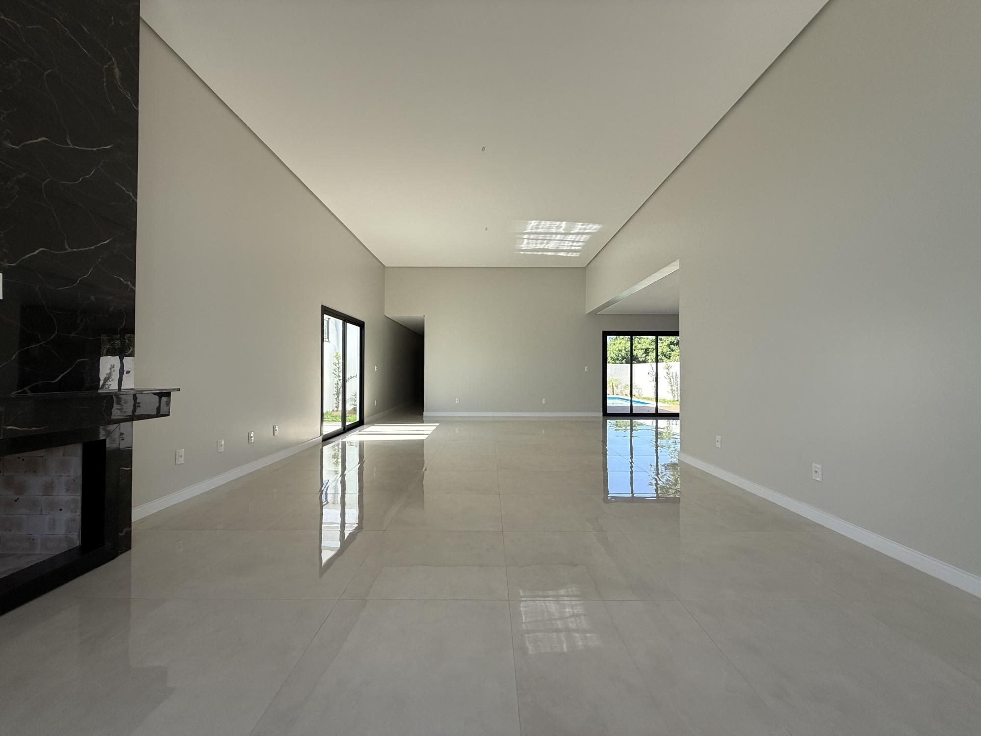 Sala de estar e jantar integrados com pé direito elevado, com lareira e acesso ao pergolado e
