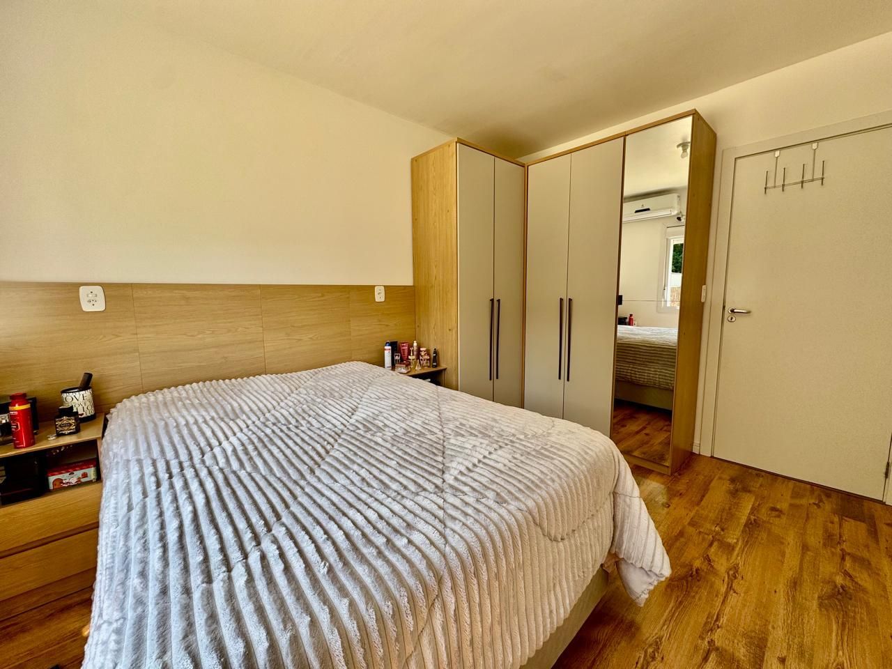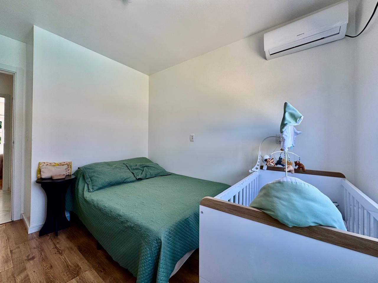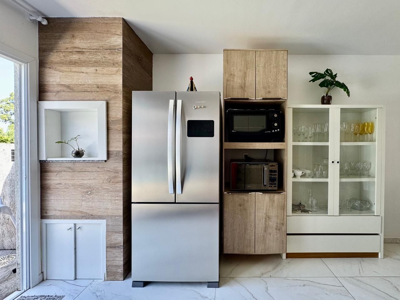 Permanecem móveis fixos da cozinha, painel da sala, roupeiro do quarto de casal e banheiro.