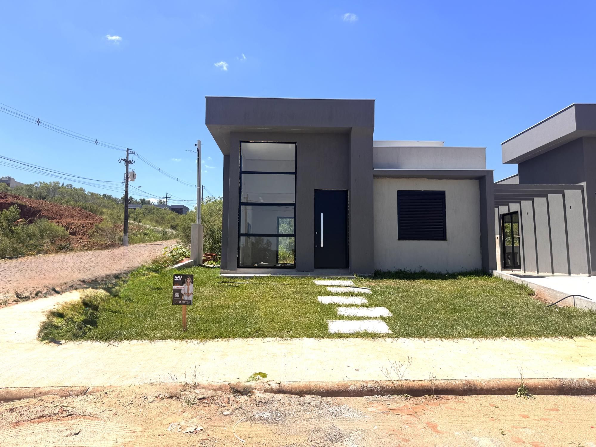 Esquadrias em alumínio, frente com gramado, divisas com mureta de 50cm.