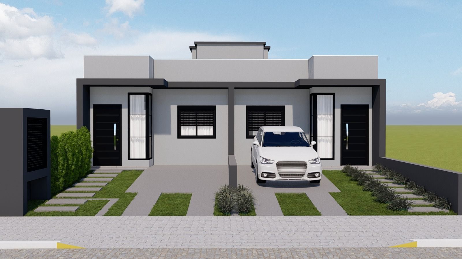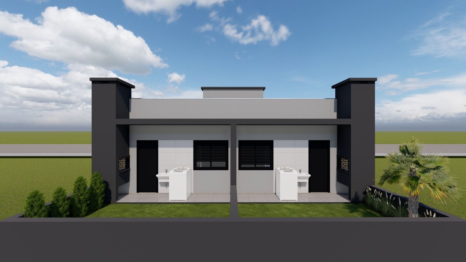 Casa Nº 01 e 02: Área de 57,00 m², composta de 02 dormitórios, banho social, lavanderia aberta, churrasqueira, sala e cozinha integrada.