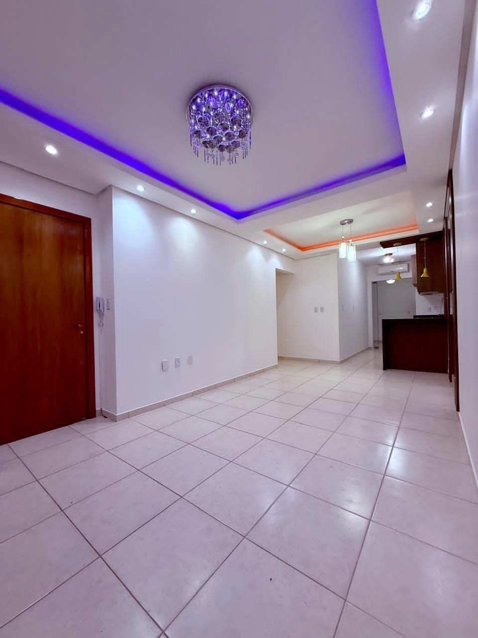 Sala de estar e jantar integradas, com rebaixamento em gesso e iluminação sofisticada;