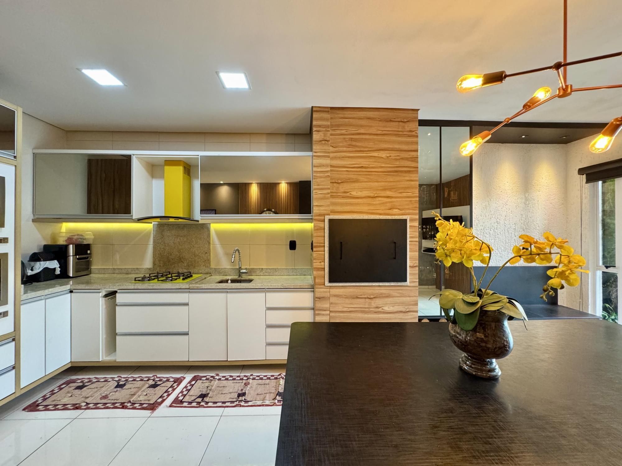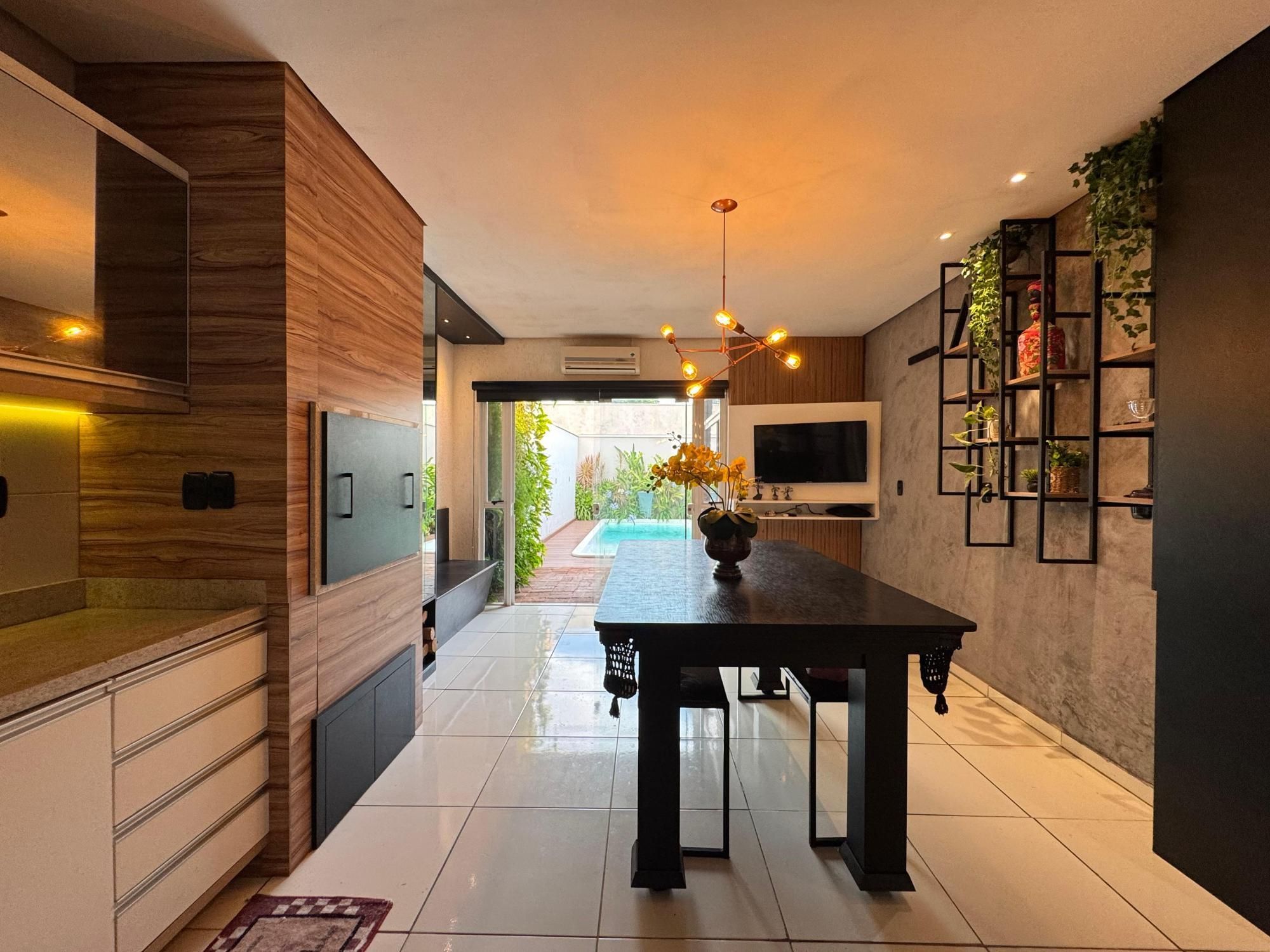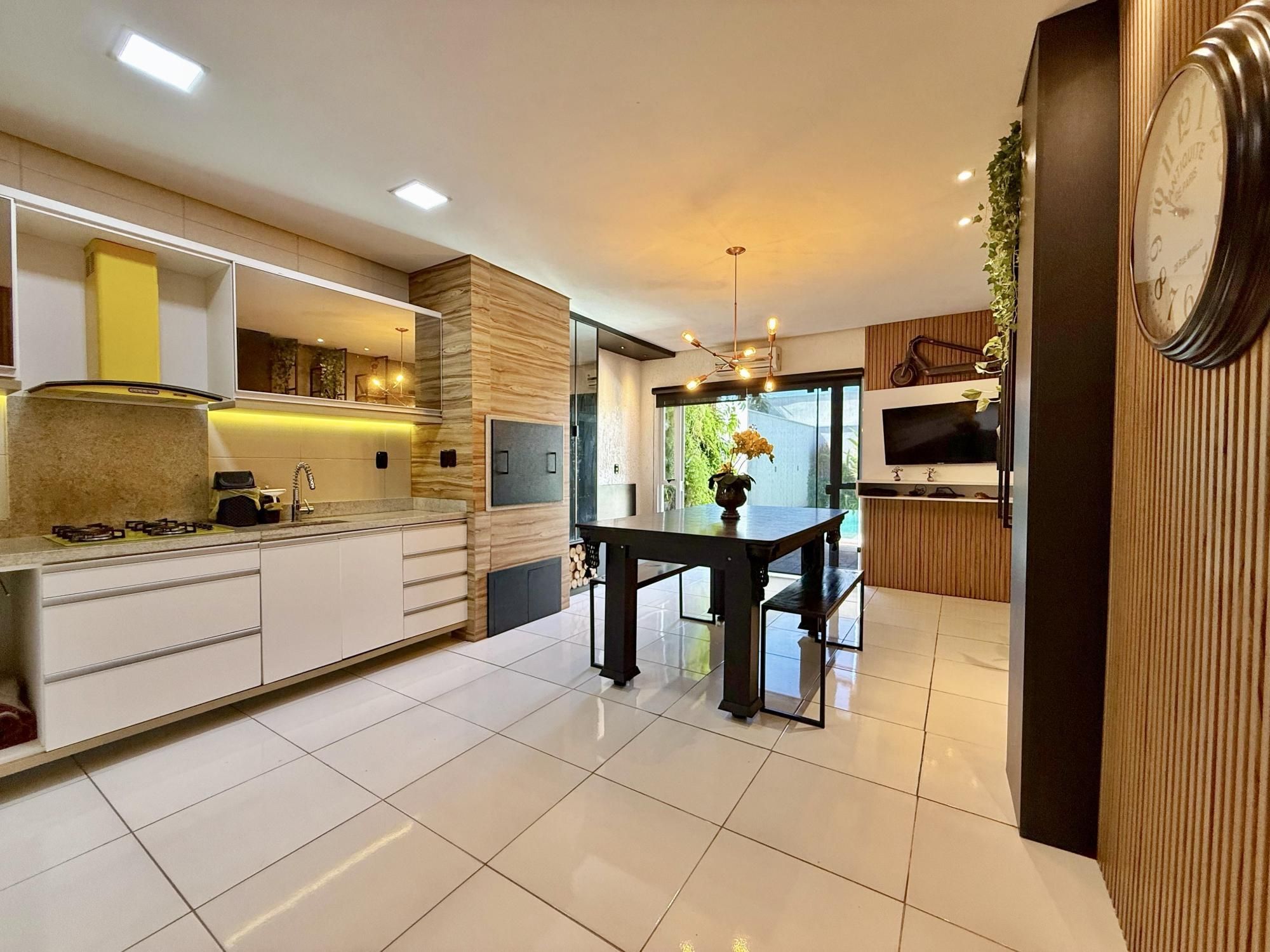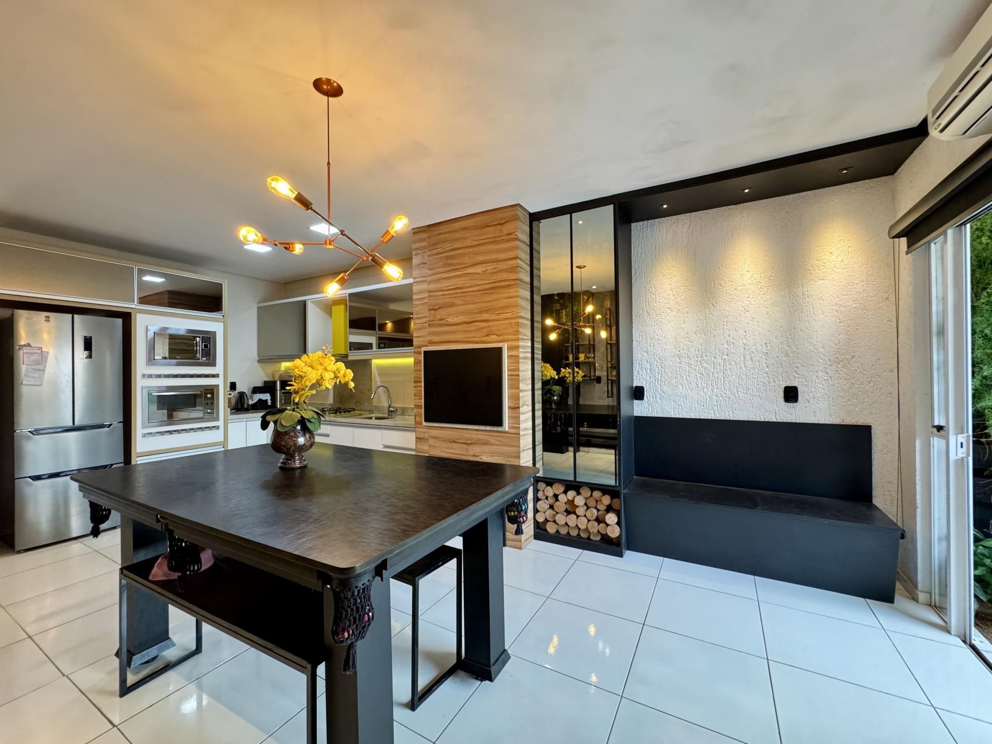 Sobrado contém uma ótima área gourmet, integrada com a cozinha, além de deck e piscina.