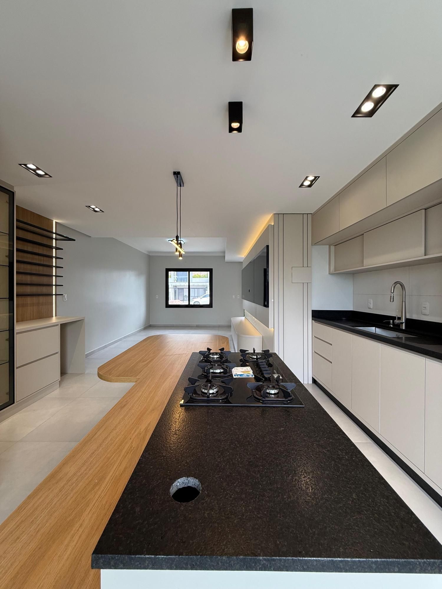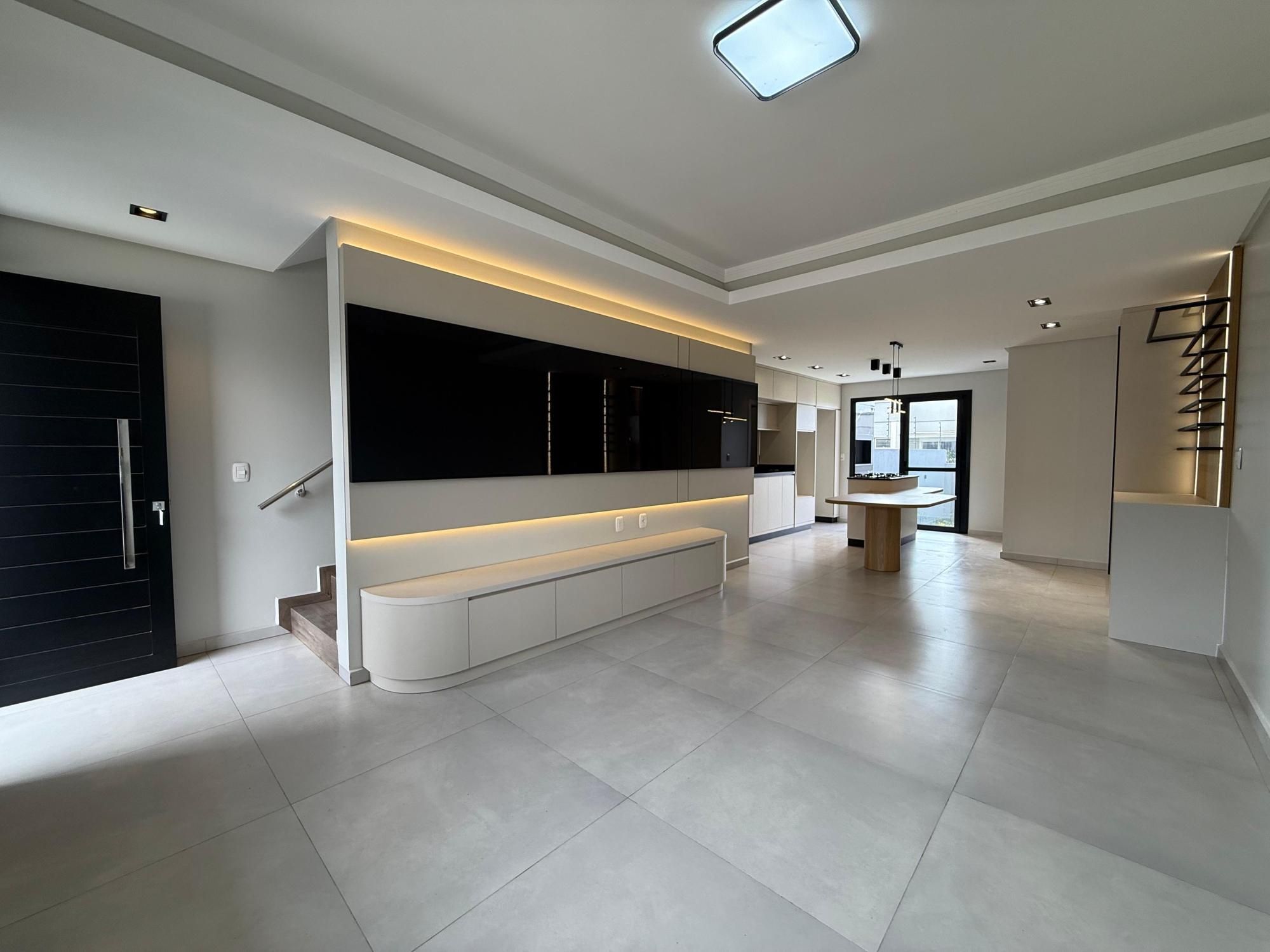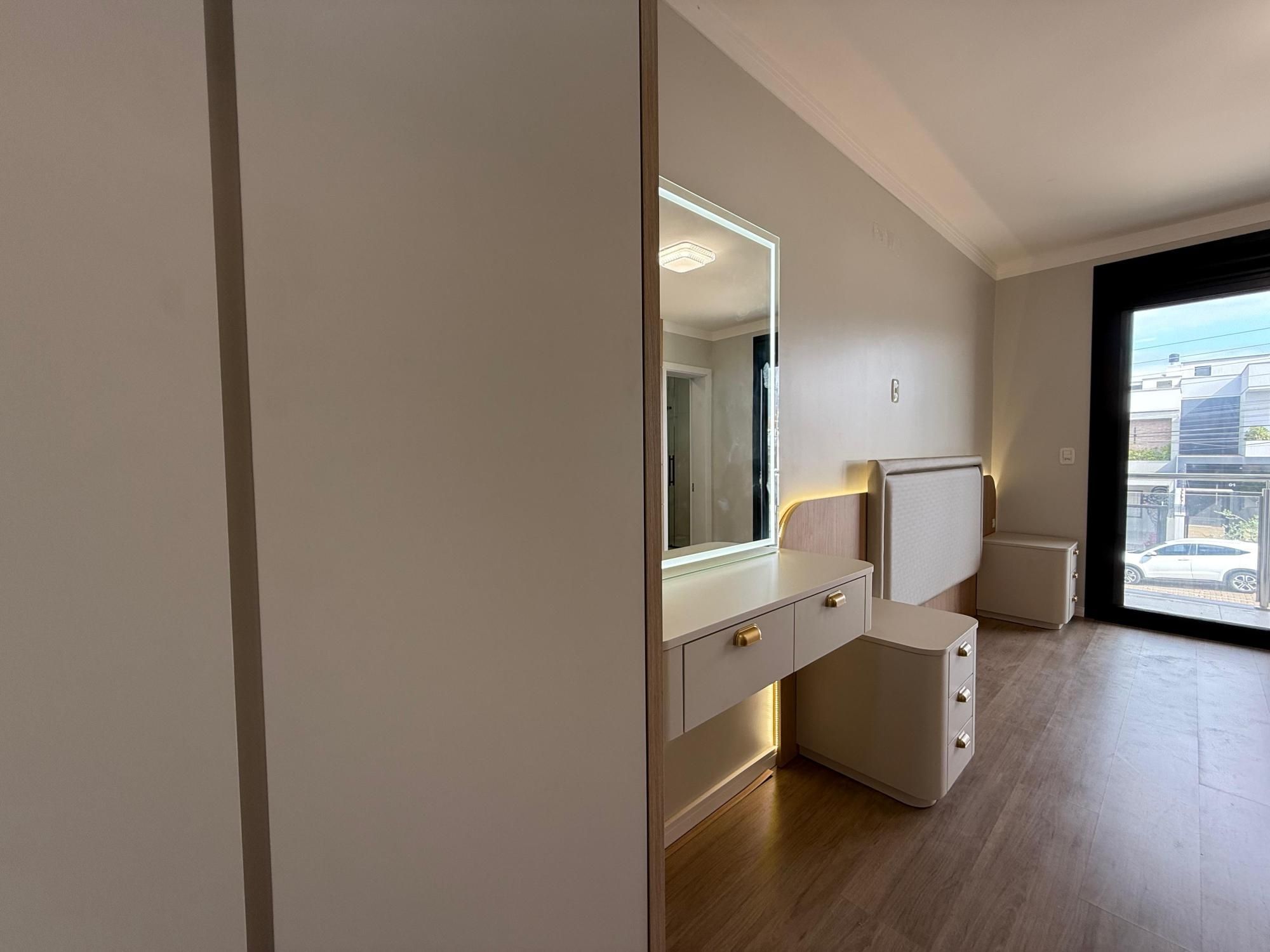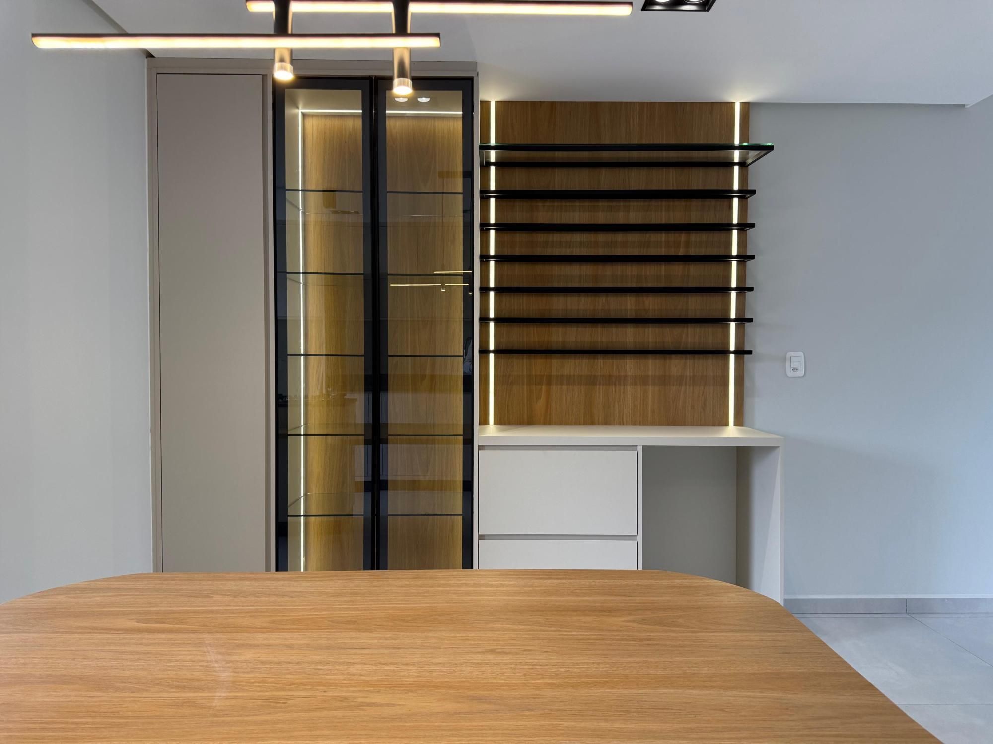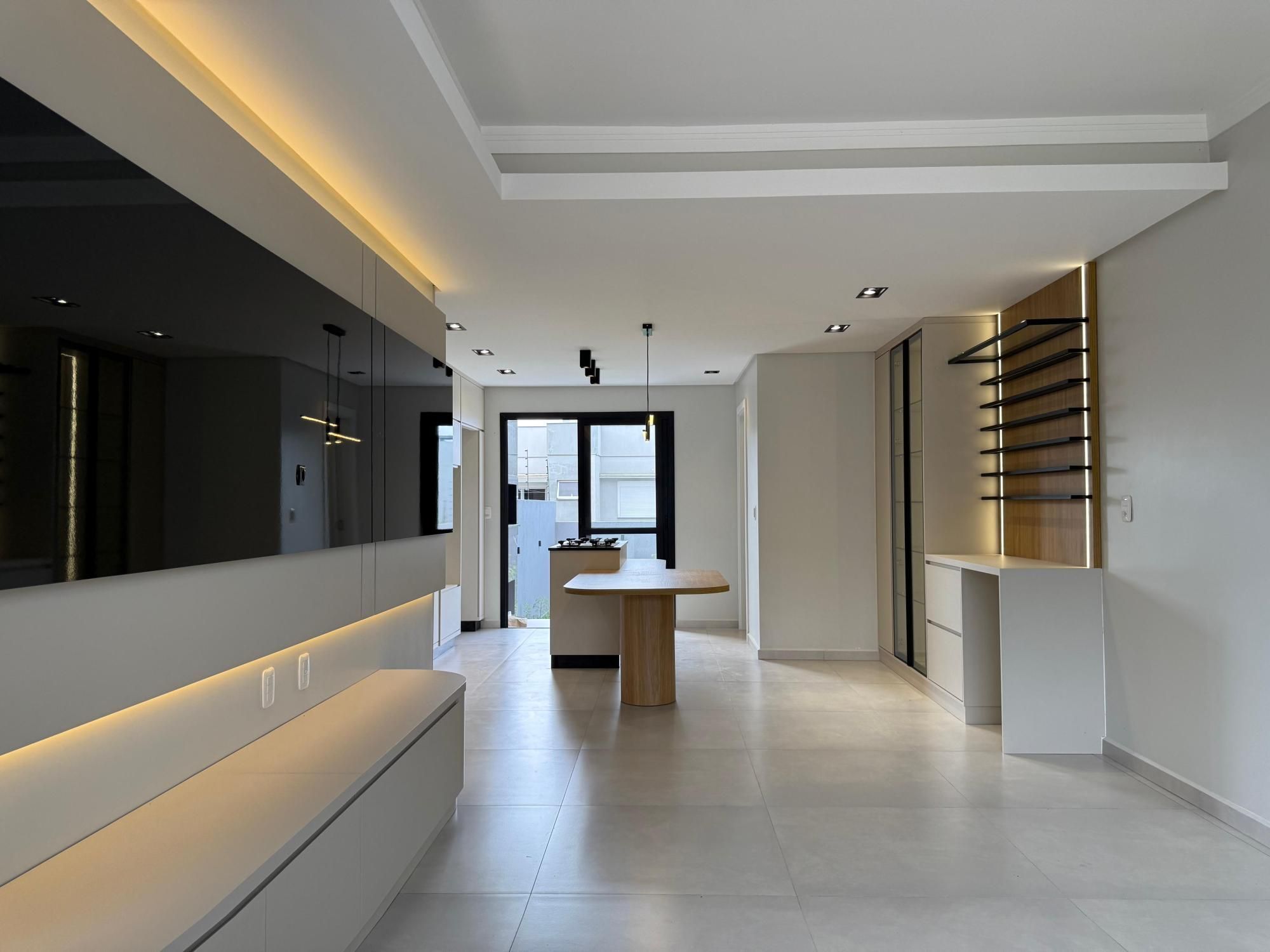 Sobrado amplo, 02 dormitórios, sendo 02 suítes, semimobiliado, cozinha sob medida, painel na sala, lavabo, iluminação completa, dormitório com closet, escritório, 02 vagas para carro. Laminado nos dormitórios, porcelanato nos demais cômodos.